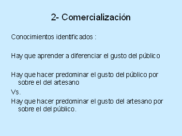 Este aspecto se vincula con el de la comercialización, ya que, al diferenciar ambos públicos, el artesano considera que debe adecuar su producción al perfil del público (por ejemplo, no llevar piezas caras o de grandes proporciones a la feria)
