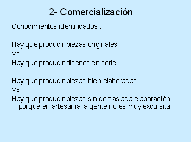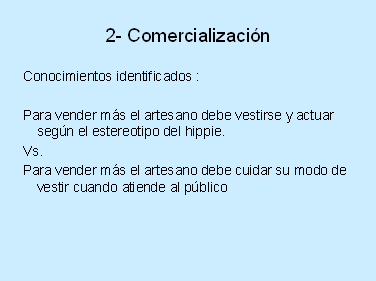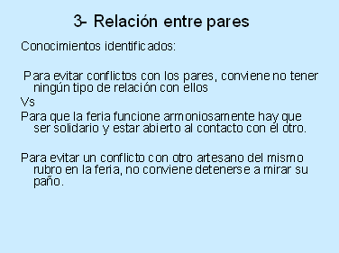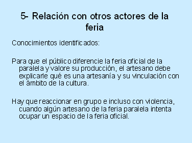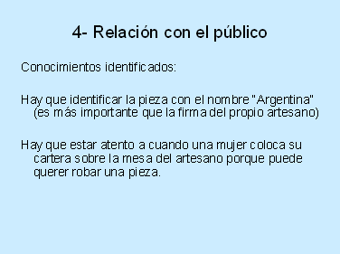 Al ir profundizando cada vez más en las entrevistas, acerca de la cotidianeidad en la Feria, del desarrollo de la actividad, de los vínculos con los otros, en los distintos ámbitos, aparecían sin embargo, descripciones de comportamientos que nos remitían a otro tipo de conocimiento surgido de situaciones bien concretas. Sólo que los mismos no eran reconocidos por los artesanos, como resultado de un aprendizaje particular sino tomados meramente, como comportamientos del sentido común.