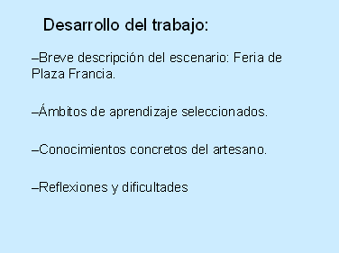 Haremos una breve descripción del escenario, caracterizaremos en términos genéricos los ámbitos seleccionados para proponer luego en forma sintética algunos conocimientos concretos que resumen el aprendizaje del artesano en cada caso.