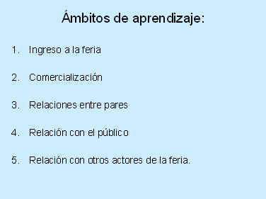 Seleccionamos para desarrollar en este trabajo, los siguientes: 1) ingreso a la feria; 2) comercialización y 3) relación con pares, 4) relación con el público y 5) relación con otros actores de la Feria. Estos ámbitos no son taxativos, se interrelacionan muchas veces entre sí, pero nos han permitido organizar el aprendizaje identificado en cada caso.