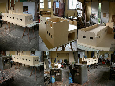 La maqueta está realizada en MDF (madera de fibra de densidad media), en escala 1: 10, esto significa que es diez veces más pequeña que el ámbito de trabajo, teniendo una medida que le permite a los niños, abarcar el volumen con los brazos estirados y abiertos, y acceder al espacio interior con la mano desde la puerta de ingreso, que opera como punto inicial de referencia. La maqueta tiene un techo de quita y pon, para permitir la exploración completa accediendo también desde arriba.