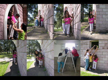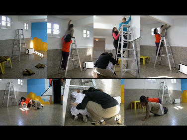 Se comienza explorando y reconociendo el lugar donde se trabaja, lo cercano, lo accesible (paredes, pisos, objetos referenciales, etc.), pero también, por medio de una escalera que colocamos intencionalmente en el aula, se busca alcanzar lo que muchas veces es inaccesible : el techo. Ascender para llegar a la arcada de acceso, al dintel de la puerta, a las ventanas altas y al cielorraso; para conocer los límites y elementos que conforman el espacio arquitectónico, los lugares a los que los niños, en general, no tienen acceso con el tacto. Esto les permite a ellos tener una idea más acabada de una construcción. Descubrir y explorar los componentes de la arquitectura que definen el espacio y caracterizarlos a partir de formas, texturas, temperaturas, sonidos al percutirlos, etc.