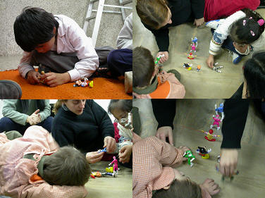 Una vez que han recorrido y reconocido la maqueta por dentro y por fuera, invitan a pasar al muñeco que cada uno ha elegido. Antes los han tocado a todos con detalle y, más aún, al que han elegido, observando qué particularidades tiene, qué partes del muñeco tienen movilidad, y cuáles están fijas e incluso imitando sus posturas.