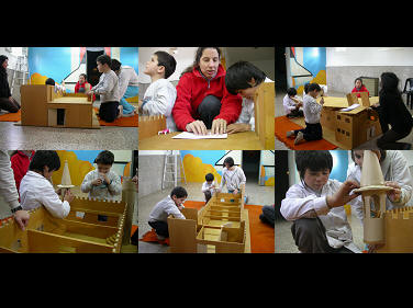 Después de la experiencia vivencial de reconocimiento del lugar donde se trabaja, pasamos del espacio real del salón a la representación de ese espacio, la maqueta del salón, para lograr componer una imagen global del espacio explorado.